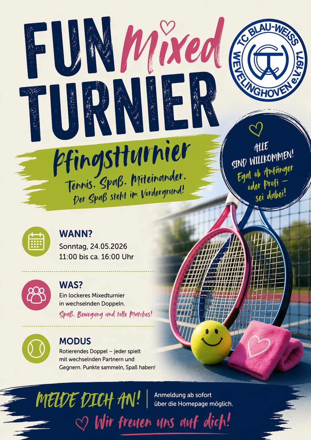 Anmeldung ab dem 1.5.26 hier auf der Seite. Die Auslosung der Spielpaarungen findet live am 3.7.26 im Clubhaus statt.